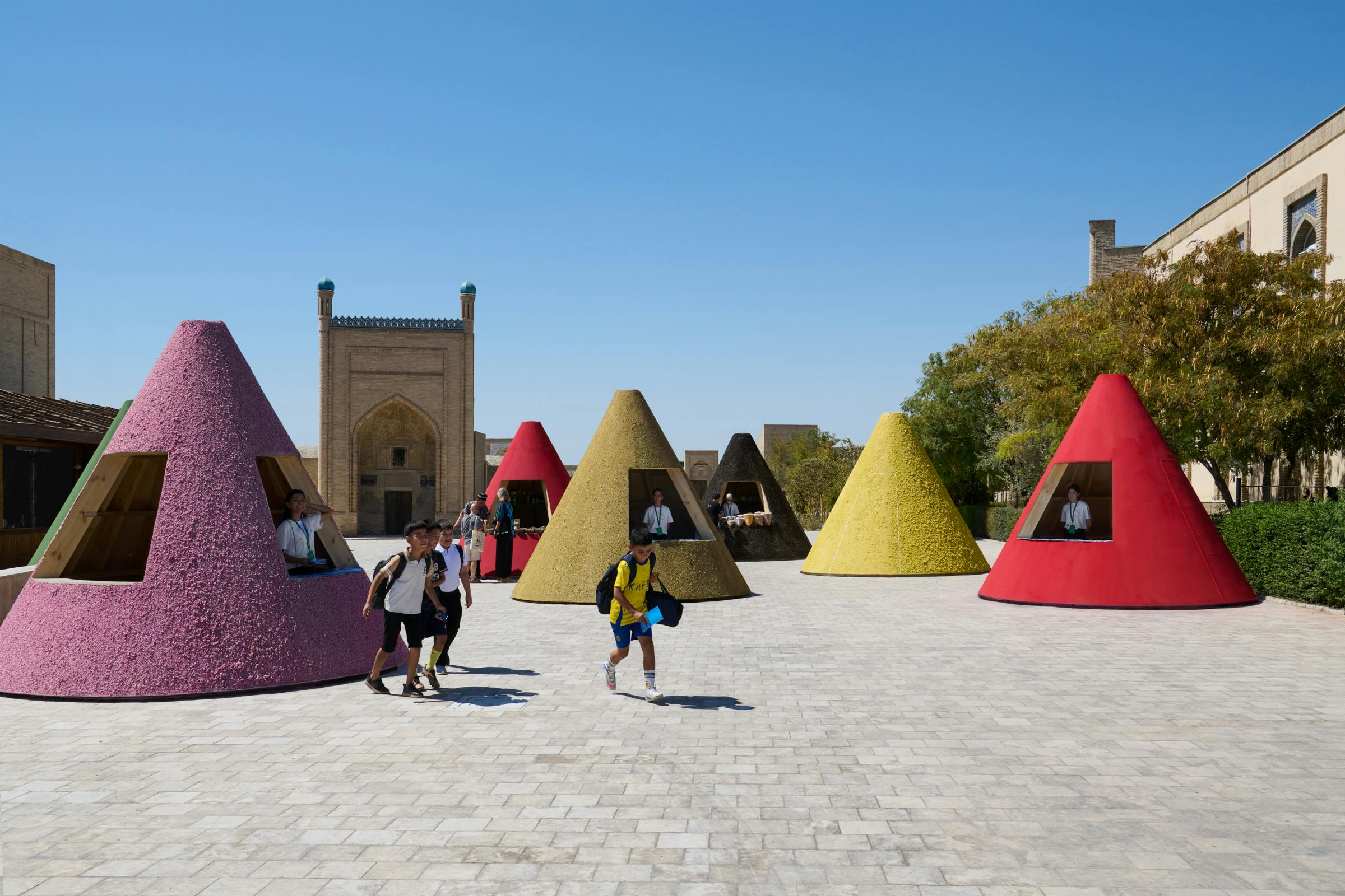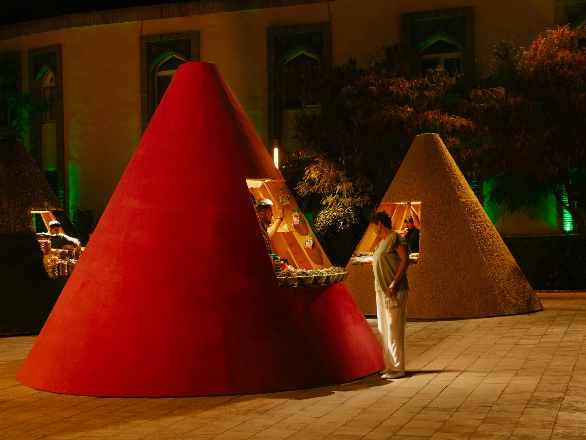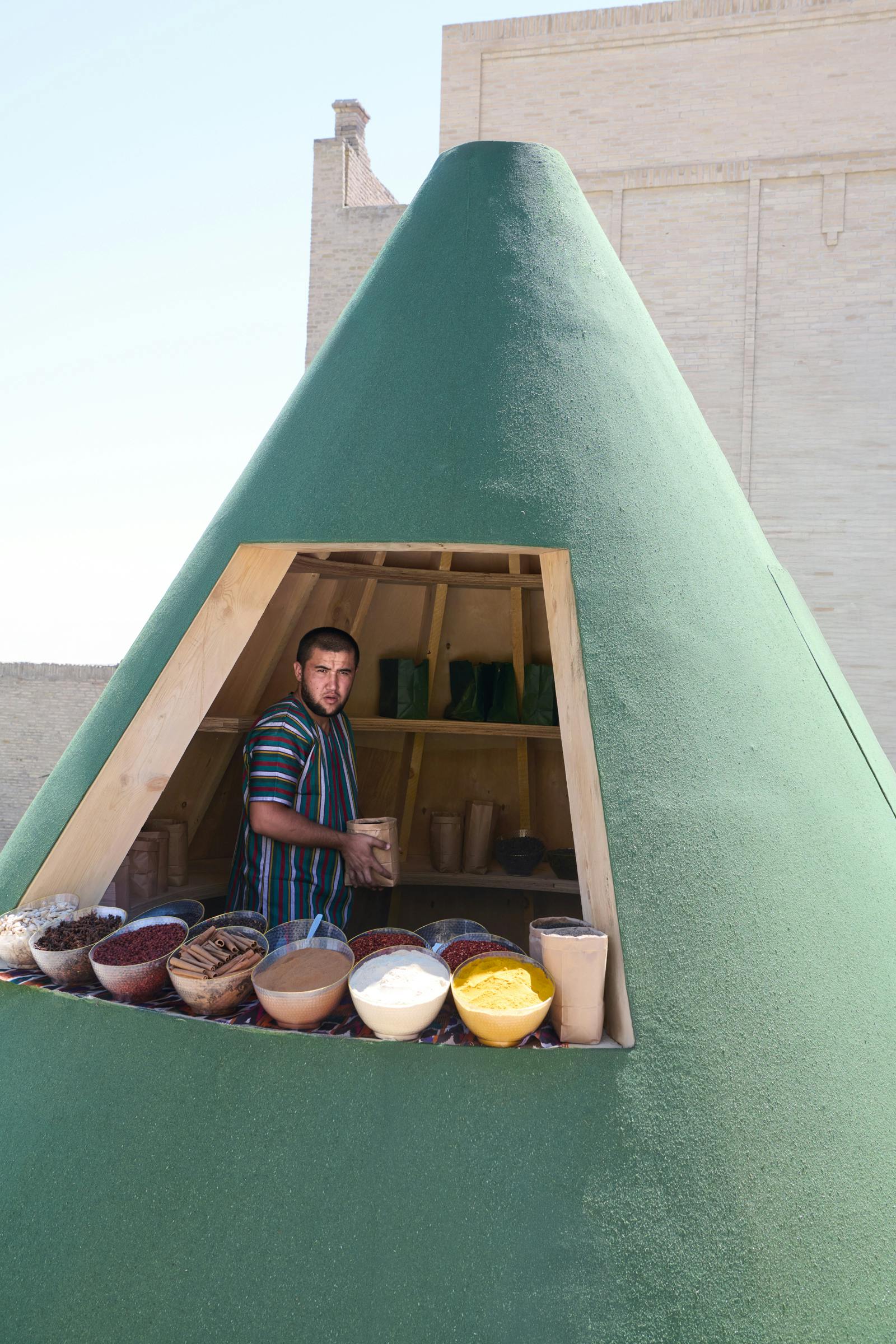 The answer emerged from Uzbekistan’s own heritage: spices. Mounds of paprika, teas, and blossoms reappeared at the very site of the old bazaar, their scents piercing through the city’s newly gleaming pavestones. The conical kiosks echo spice displays in Uzbek markets and the pitched roofs of rural houses. Conceived for easy transport, they will later be donated to local communities.