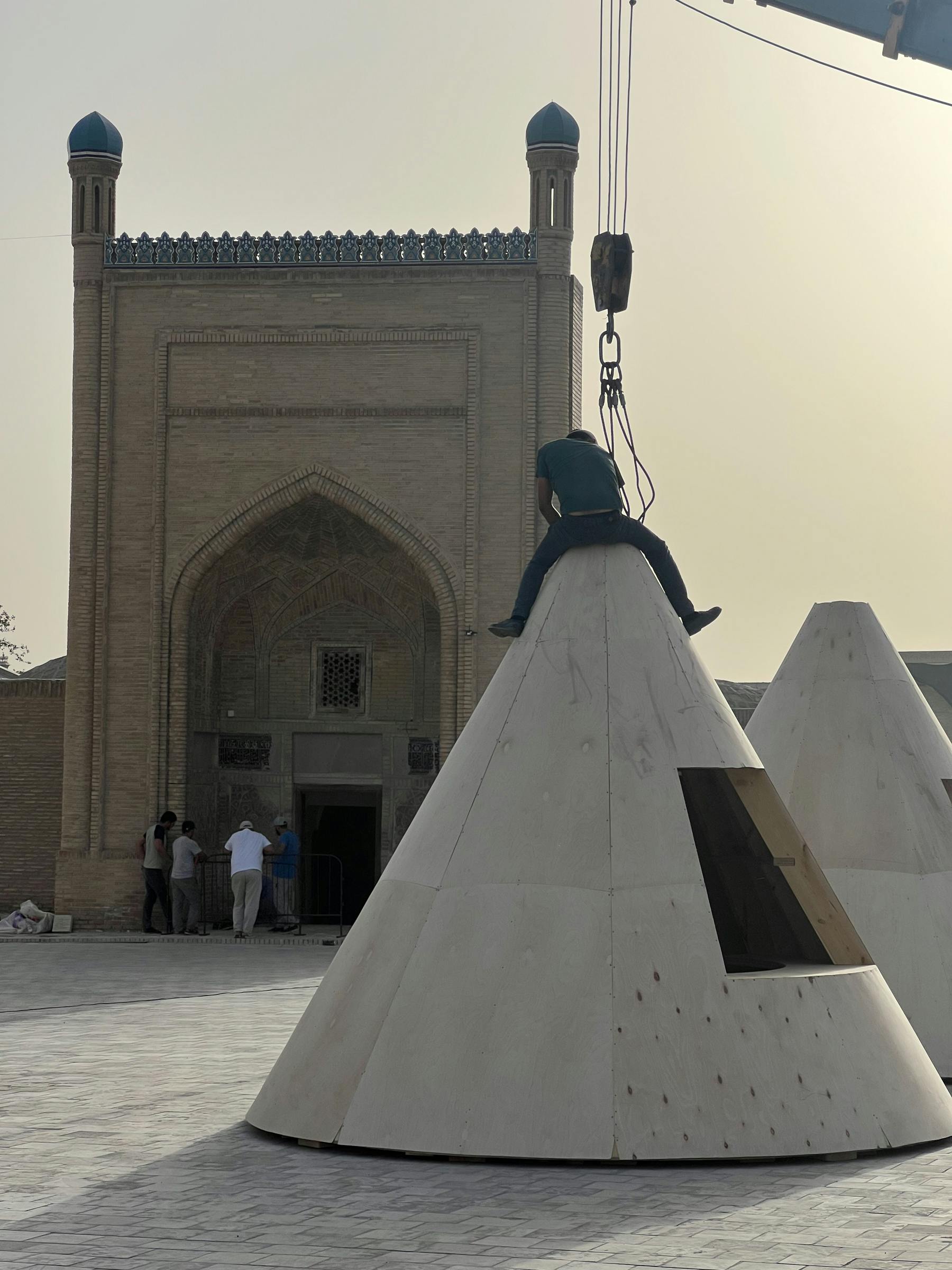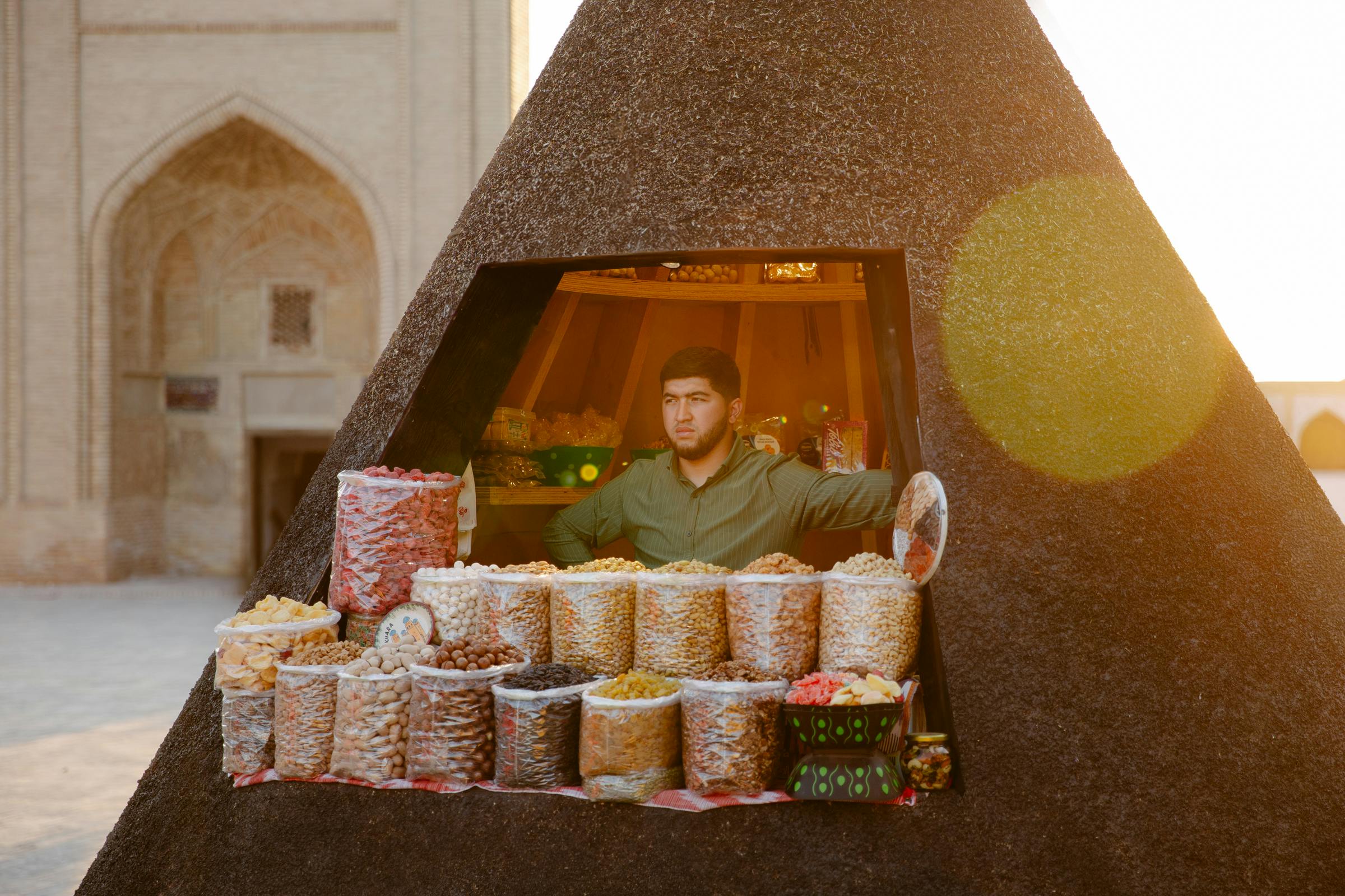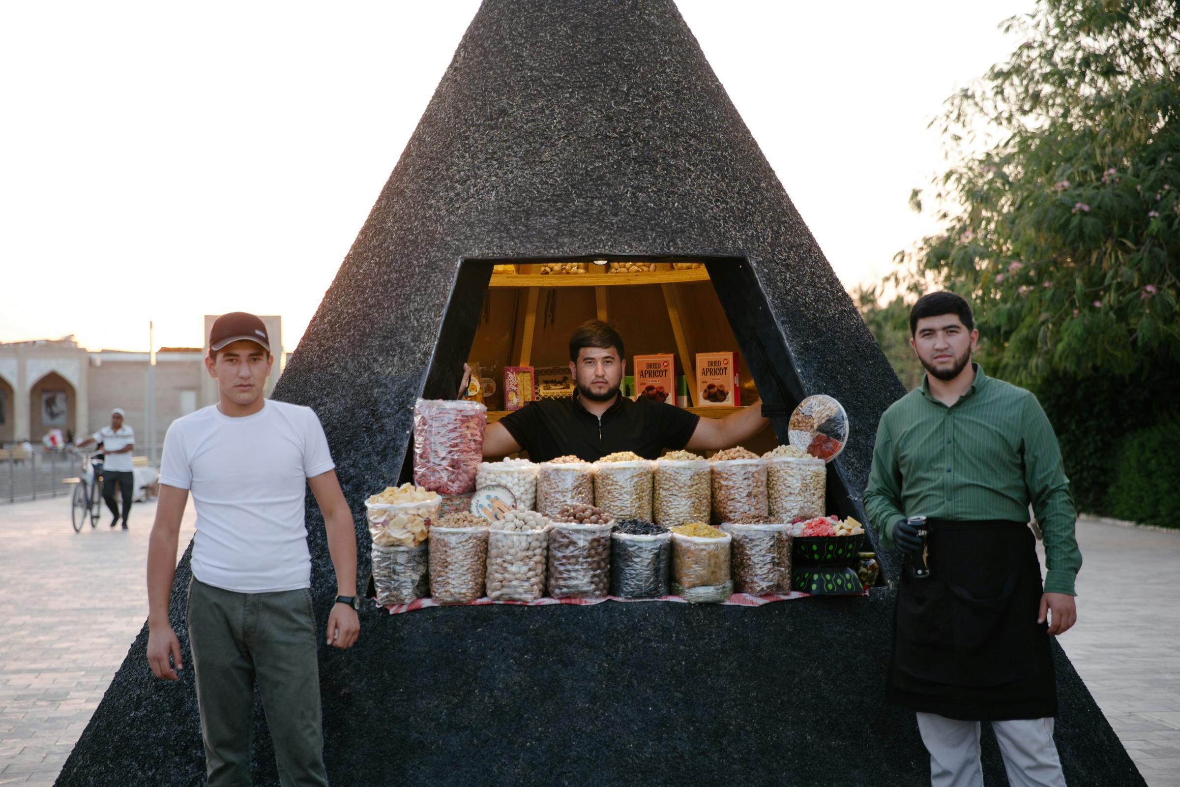 The answer emerged from Uzbekistan’s own heritage: spices. Mounds of paprika, teas, and blossoms reappeared at the very site of the old bazaar, their scents piercing through the city’s newly gleaming pavestones. The conical kiosks echo spice displays in Uzbek markets and the pitched roofs of rural houses. Conceived for easy transport, they will later be donated to local communities.